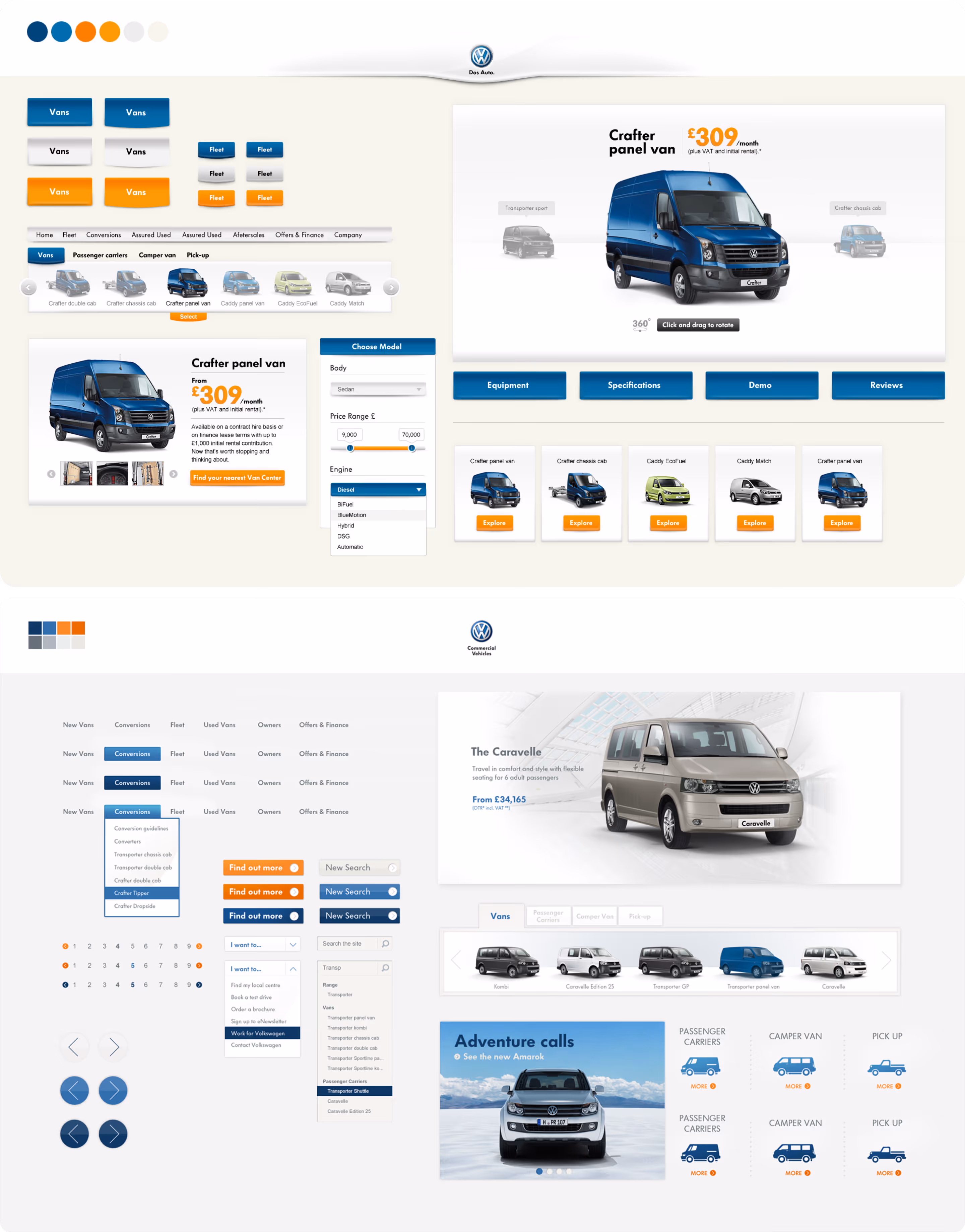 Redesign of the VW UK Commercial Vehicle website. This complete redesign features a brand new "look and feel" and tailor-made back-end. The idea was to create a unique experience for the users, so they can easily and quickly find the information they need about vehicle specifications, price ranges and model availabilities in a very intuitive way.